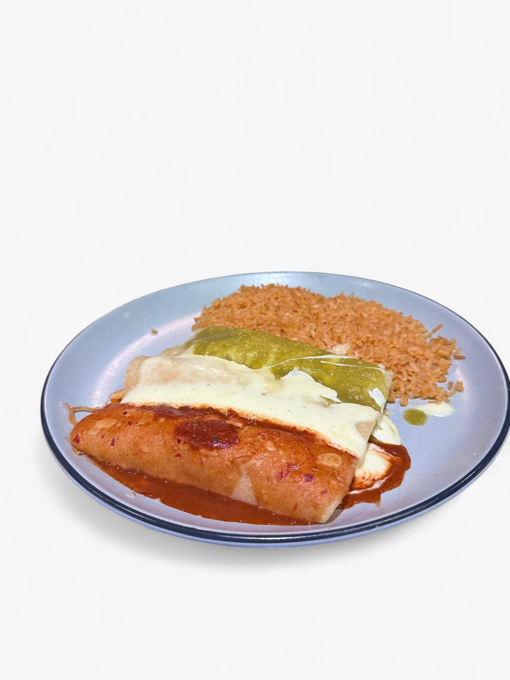 | ENCHILADA Your choice of seasoned ground beef or shredded chicken enchilada topped with melted cheese and served with rice and beans. | 8.50 |